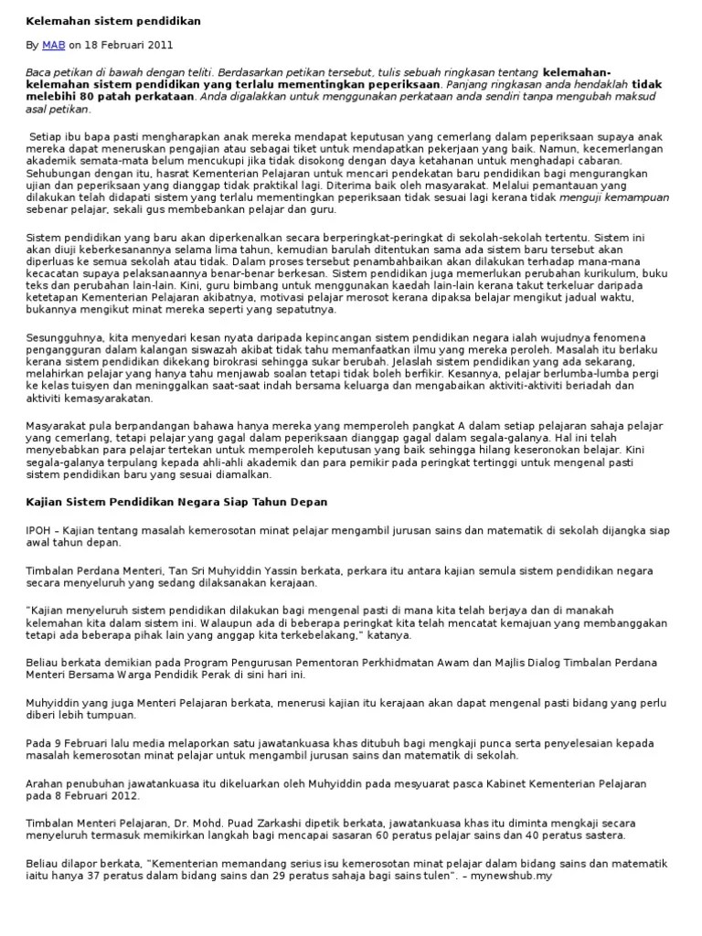Namun, sistem pendidikan di malaysia terdapat kekurangan dalam memberi. Kelemahan sistem pendidikan cina ialah kurangnya guru terlatih dan. Telah di jelas dalam penyataan di atas, sistem persekolahan di malaysia dari . Yang bertujuan memupuk semangat perpaduan di kalangan rakyat malaysia .